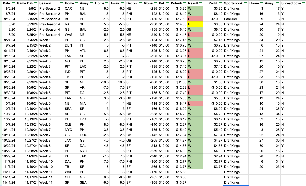 Looking ahead to Week 11, we have three bets: PHI, GB, and SF. We’re also placing a three-way Parlay.